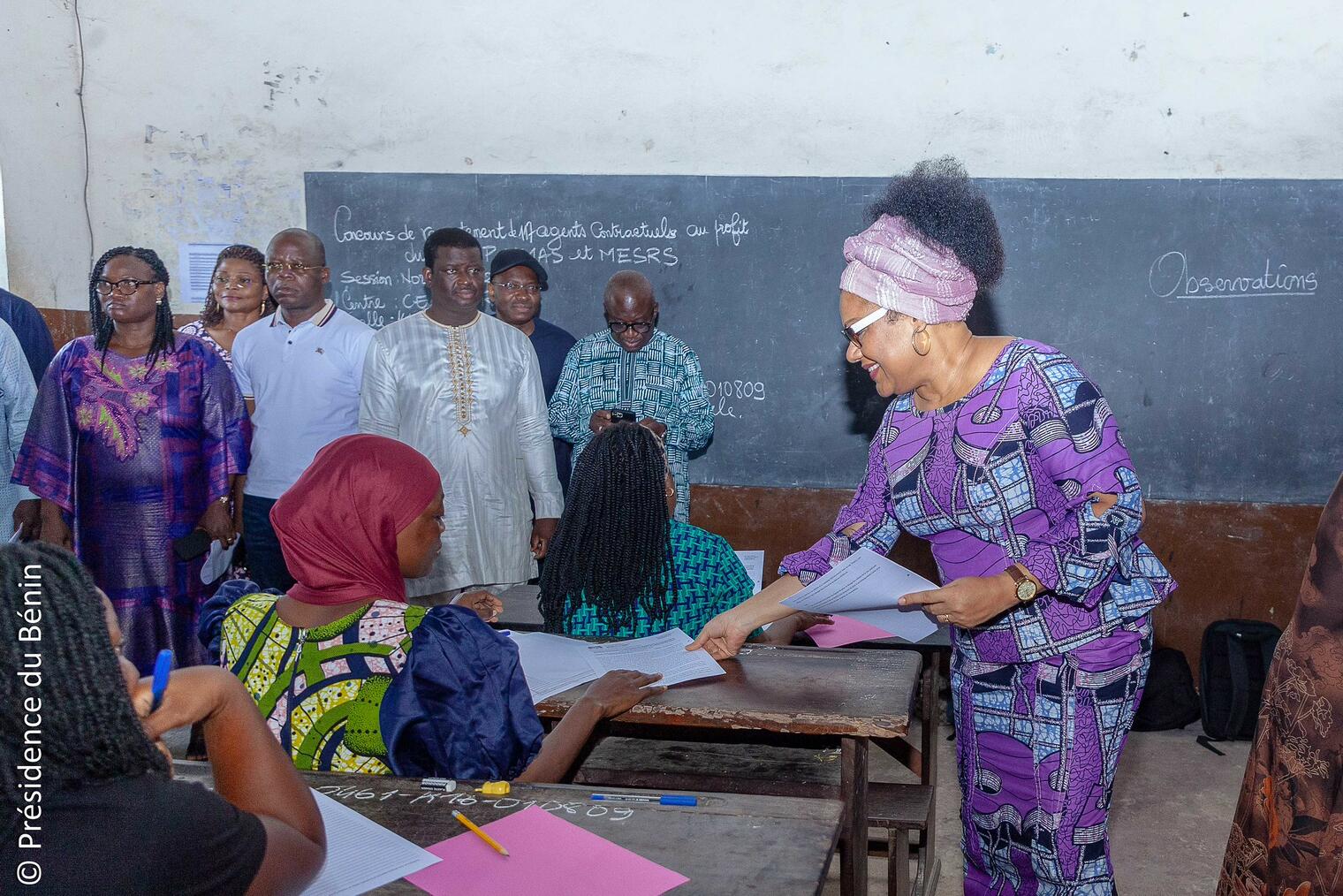 Les Ministres Adidjatou MATHYS de la fonction publique, Véronique TOGNIFODÉ des affaires sociales, Eléonore YAYI LADEKAN de l'enseignement supérieur ainsi que la Ministre Conseillère Mariam DJAOUGA SACCA ont procédé, le samedi 15 novembre 2025, au lancement officiel des épreuves du concours de recrutement de 117 contractuels de droit public de l’État. La cérémonie s’est déroulée au CEG Sainte Rita à Cotonou, sous les regards des candidats et des équipes techniques mobilisées pour garantir le bon déroulement de cette étape décisive.