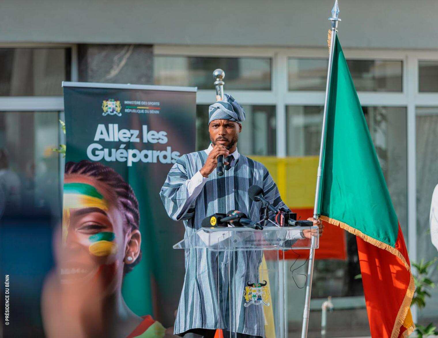Dans un élan de ferveur patriotique, le Ministre des Sports a adressé un message fort d’encouragement et de motivation aux joueurs : « À travers ce drapeau que nous vous remettons, c’est bien plus qu’un symbole que la Nation vous confie. C’est l’âme du Bénin, c’est l’espérance de tout un peuple, c’est la chaleur et l’énergie de plus de 14 millions de Béninoises et de Béninois qui vous accompagnent ici, au Maroc, et tout au long de cette compétition. »