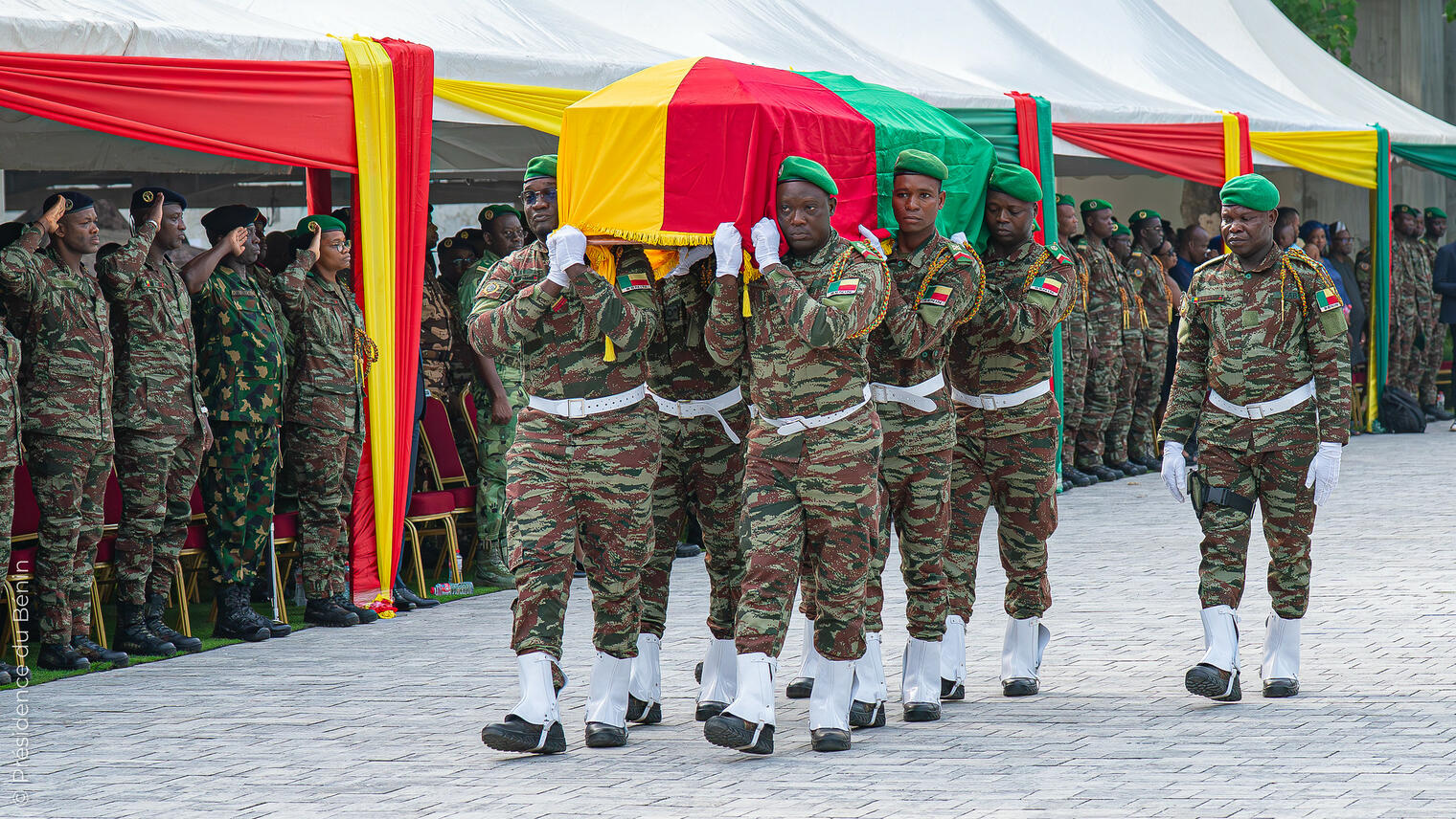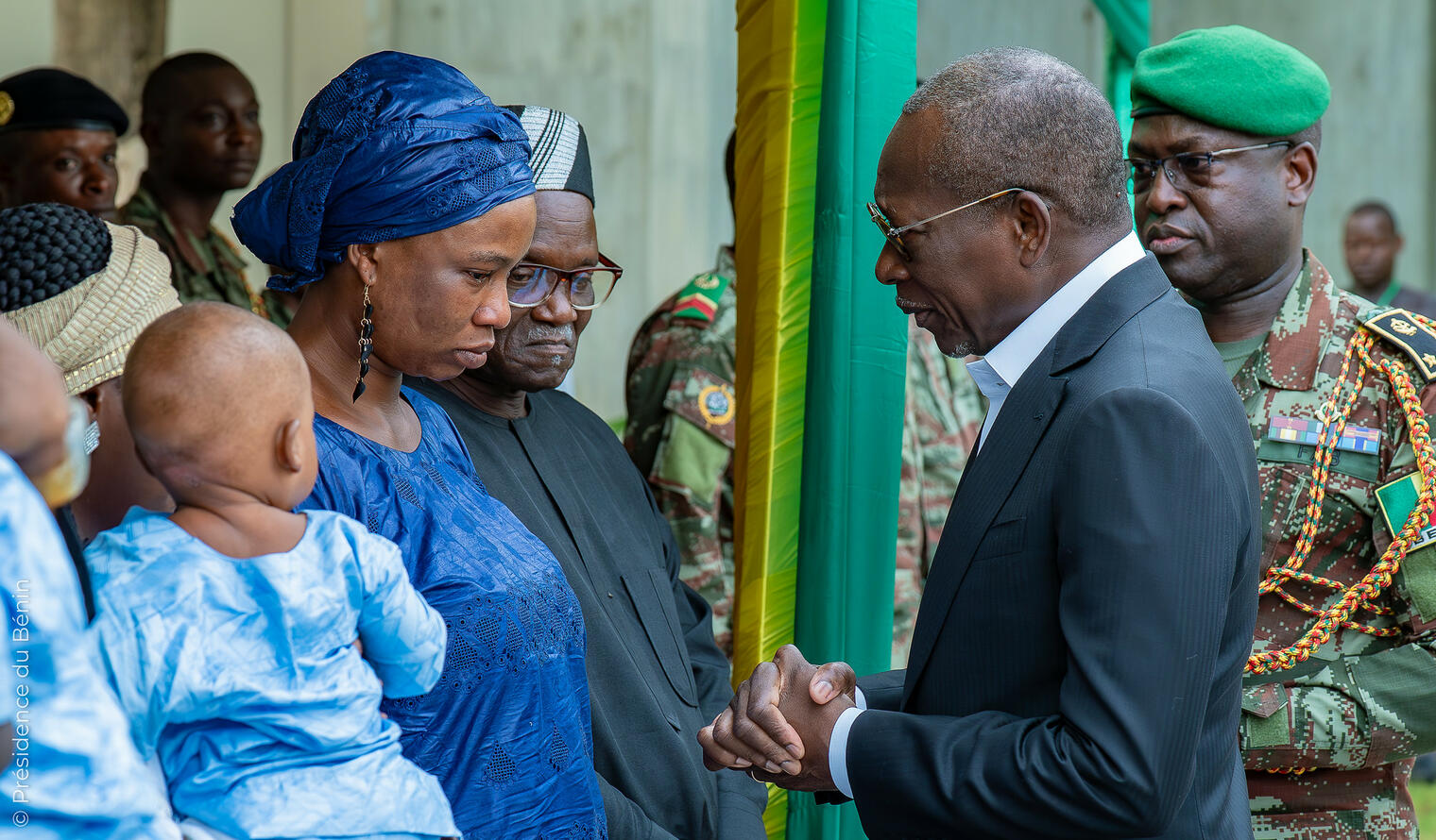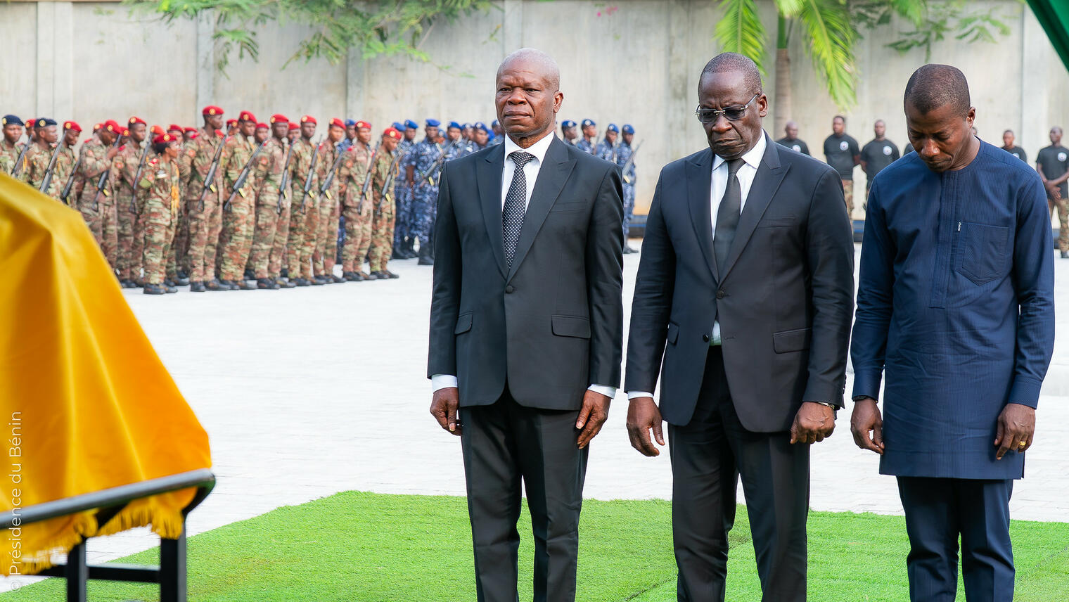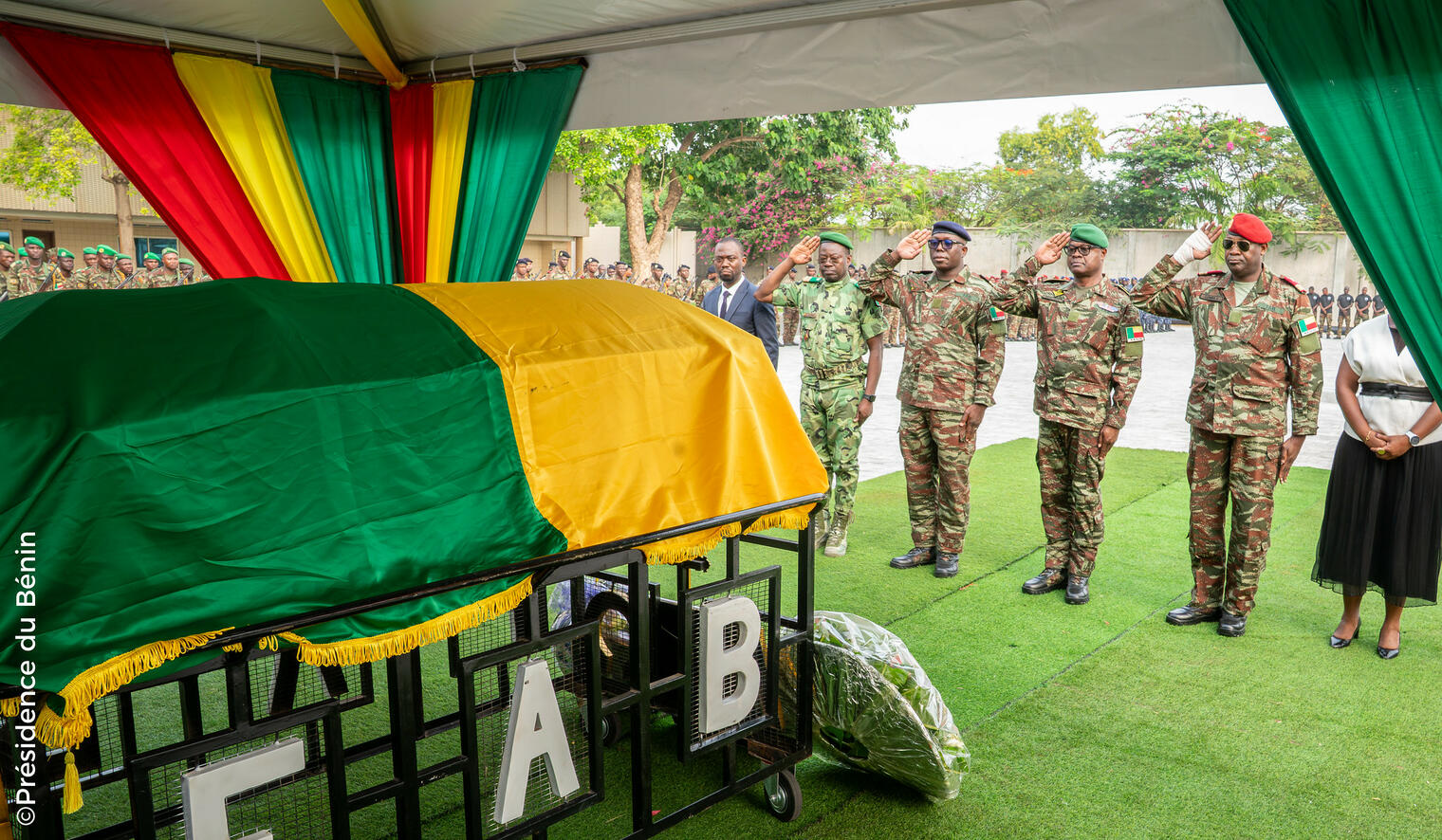 Présent à la cérémonie, le Président de la République, Chef Suprême des Armées, s’est incliné devant la dépouille, marquant ainsi la reconnaissance de toute une nation. Il n'a pas manqué de réconforter la veuve et la famille du soldat. Si Jean-Baptiste laisse derrière lui deux orphelins, le Général TÉVOÈDJRÈ a tenu à rassurer ses proches : « Votre fils est la raison pour laquelle notre drapeau flotte encore fièrement. Son sacrifice est le socle de notre liberté ».