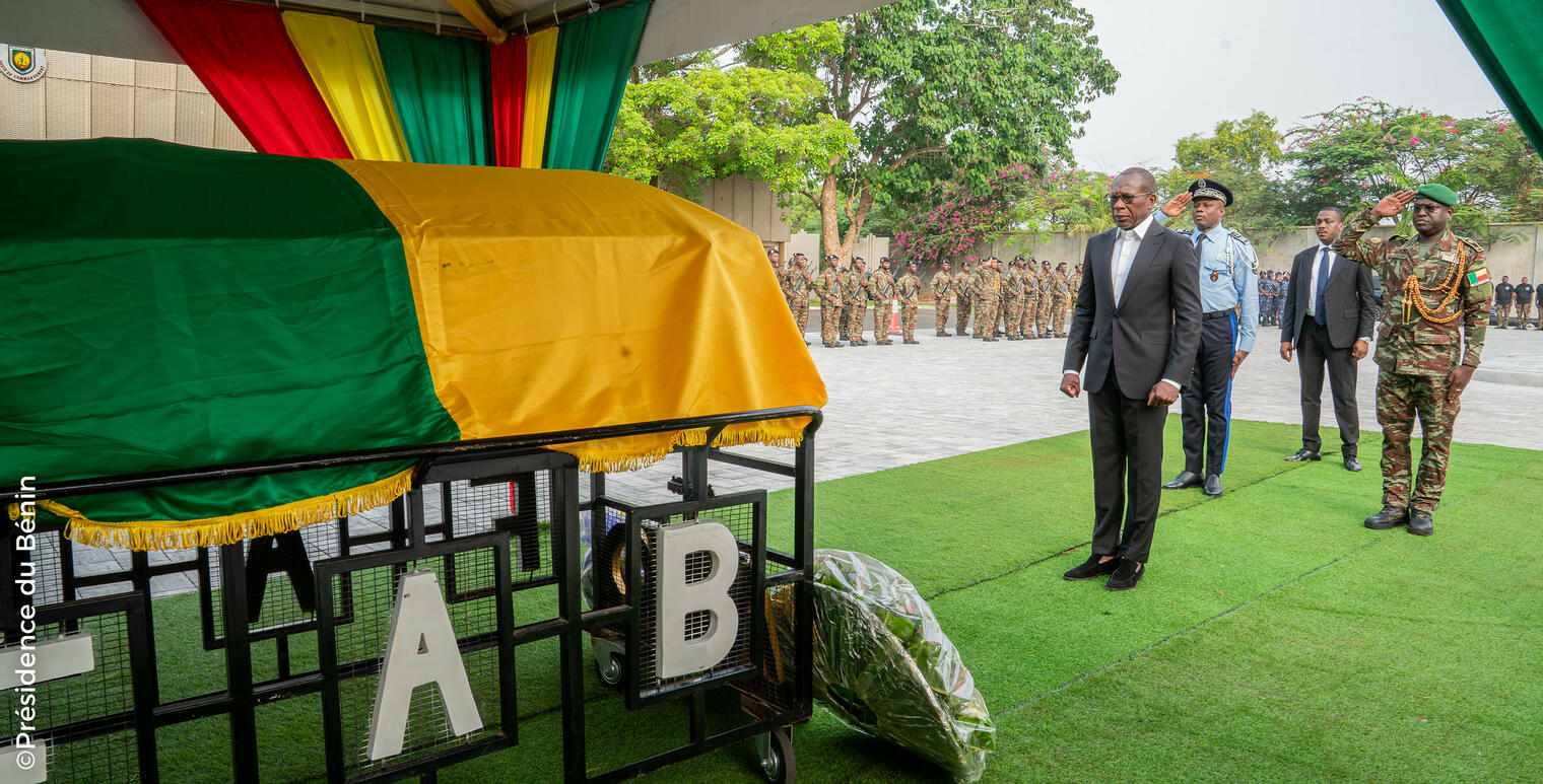 Le samedi 17 janvier 2026, la place d'armes de la Garde Républicaine, au Palais de la Marina, s’est figée dans un silence de recueillement. Dans une atmosphère chargée d'émotion, le Bénin a rendu un hommage national et solennel au Quartier-maître de 1ère classe Jean-Baptiste DOTOU, tombé au champ d’honneur le dimanche 7 décembre 2025, lors de la tentative de coup d’État. Une entreprise lâche qui, loin d'ébranler les fondements de la République, a exalté les élans patriotiques et l'esprit de corps.