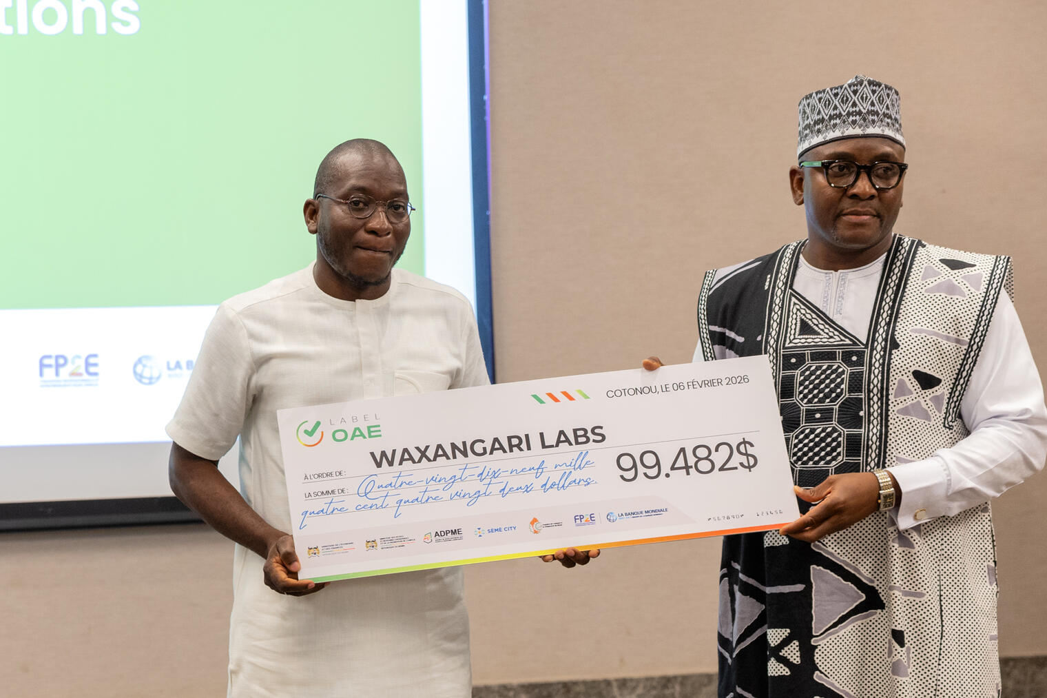 L’Agence de Développement de Sèmè City (ADSC) et l’Agence de Développement des Petites et Moyennes Entreprises (ADPME), avec le soutien du Ministère des Petites et Moyennes Entreprises et de la Promotion de l’Emploi, du Ministère de l’Économie et des Finances, de la Chambre de Commerce et d’Industrie du Bénin, et avec l’appui technique et financier de la Banque mondiale à travers le Projet Formation Professionnelle et à l’Entrepreneuriat pour l’Emploi au Bénin (FP2E), ont procédé à la remise officielle de subventions à 15 Organisations d’Appui à l’Entrepreneuriat (OAE) labellisées.