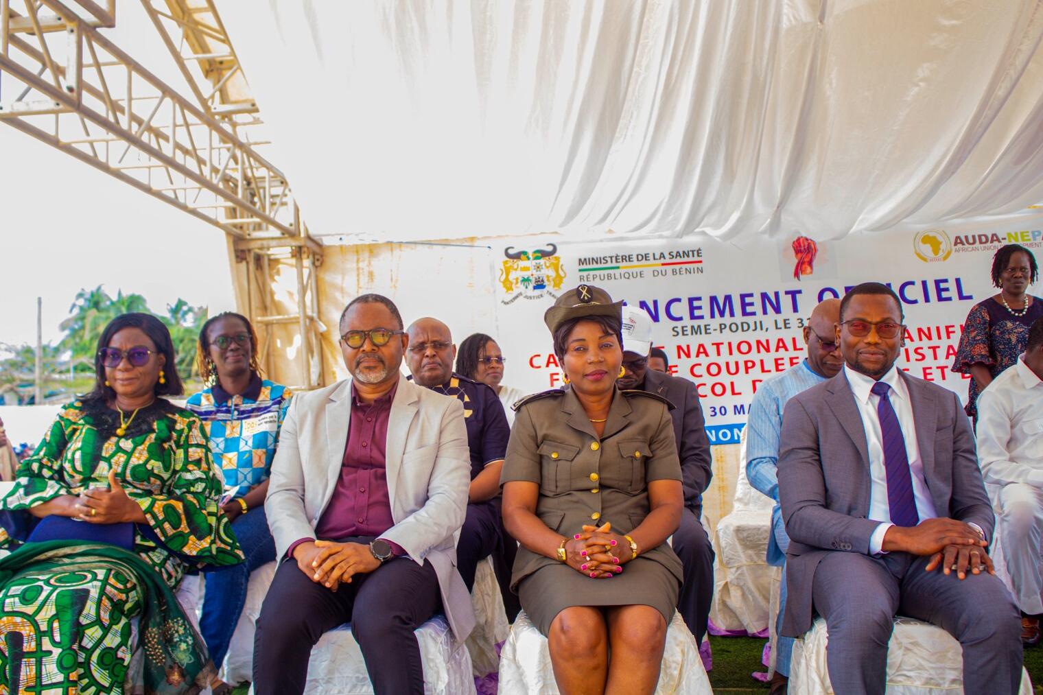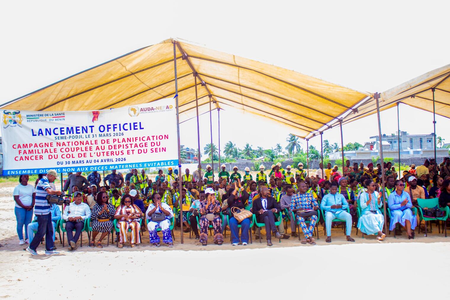 Le Ministre de la Santé, Prof. Benjamin HOUNKPATIN, a procédé le mardi 31 mars 2026 au lancement officiel de la campagne nationale de planification familiale couplée au dépistage des cancers du col de l’utérus et du sein. La cérémonie s’est déroulée au stade communal de Sèmè-Podji en présence de Madame le Préfet du département de l’Ouémé, Dr Marie AKPOTROSSOU, des autorités politico-administratives et des représentants de l’OMS et de l’UNFPA.